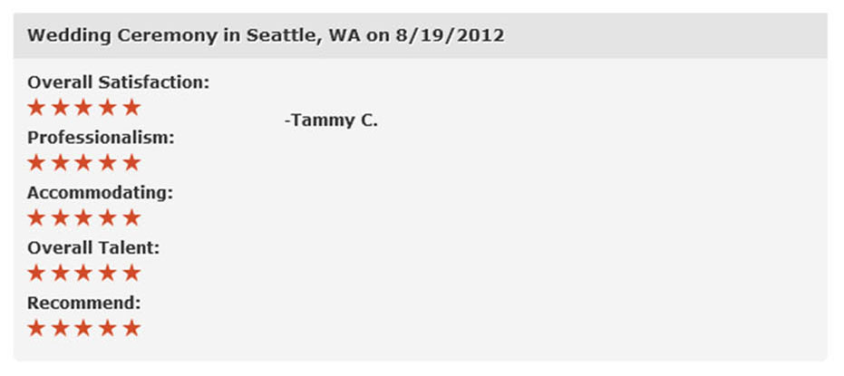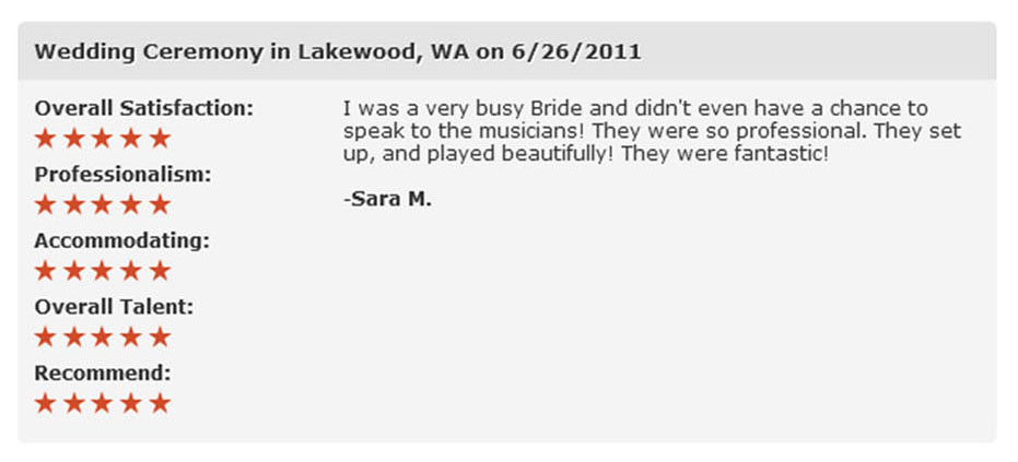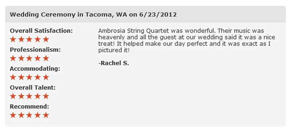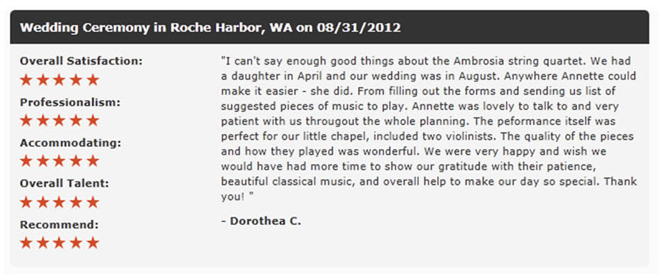 The music was absolutely beautiful were we as well as our guests loved the variety of selections. Additionally, we love the fact that we were able to select a piece that was not on the list of available songs (small fee but absolutely worth it) of which they performed beautifully. We were so pleased with the music, professionalism, and elegance which raised the bar higher than we ever expected and one of which the other quartets with in the Seattle area could not uphold. If you want that extra sense of elegance and beauty for your wedding, Ambrosia String Quartet is the way to go!!! Thank you so very much, we couldn't have asked for anything better!!!